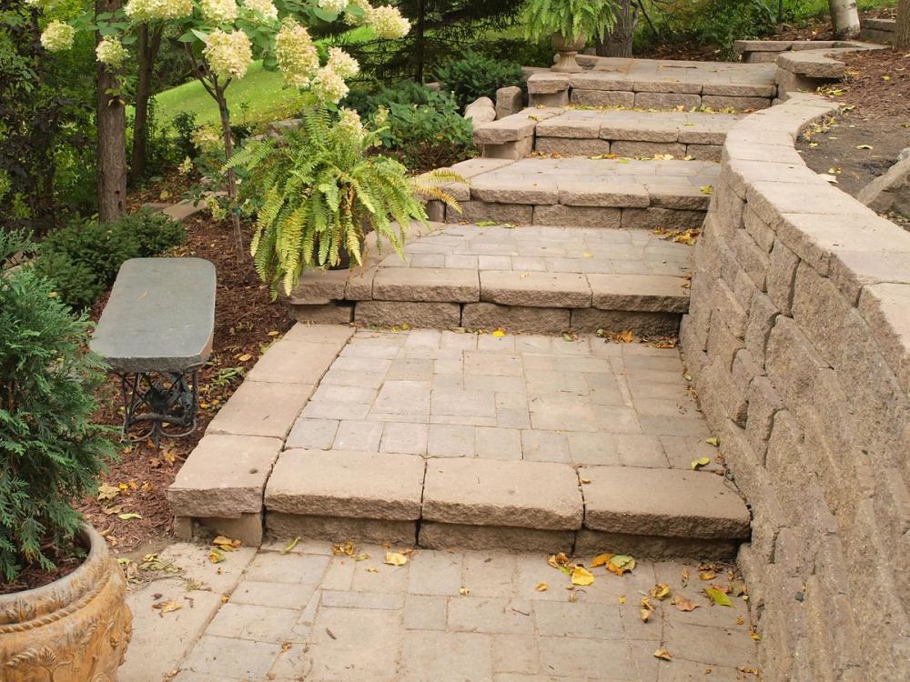 Allan Block stairs can be built along curved walls and walkways, creating smooth transitions that follow the natural flow of the landscape.