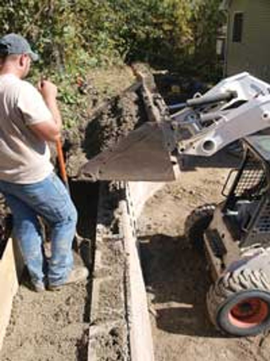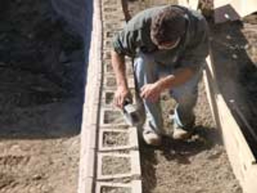 Refer to the AB Commercial Installation Manual for detailed instructions on preparing the base trench and installing the first course of block. After the first course is installed and leveled, follow these steps for placing No-Fines concrete backfill.
