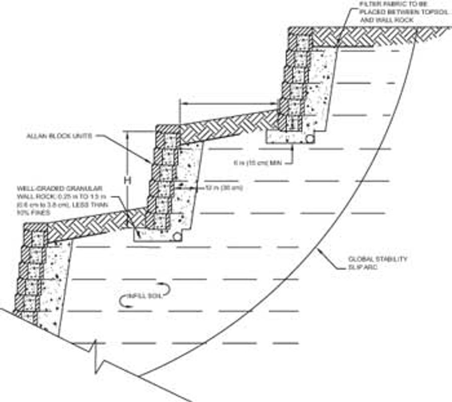 Global stability is frequently overlooked. All walls with slopes above or below, as well as terraced walls, should undergo a global stability analysis. Local codes often require a 5–7 ft (1.5–2.1 m) level bench in front of the wall to aid stability.