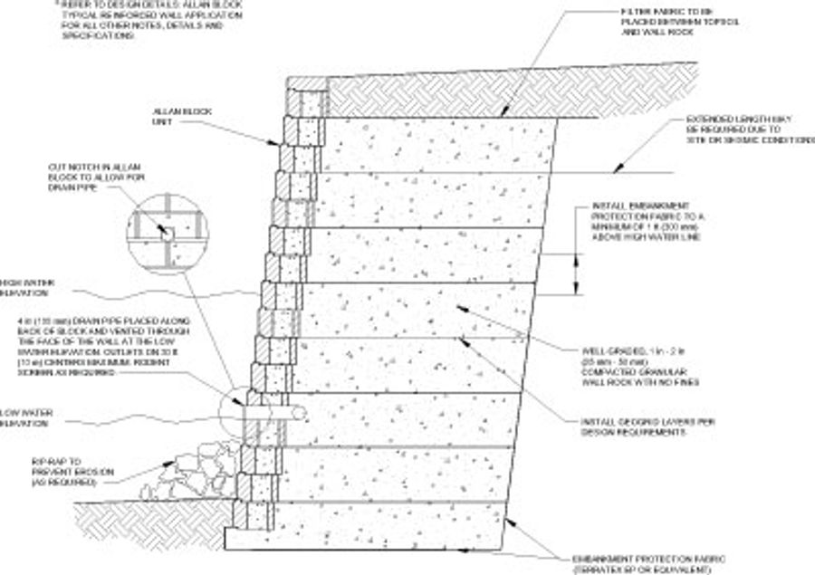 Segmental retaining wall (SRW) units are widely used for water applications including detention basins, ponds, lakes, rivers, and wetlands. Designing walls for water applications follows the same principles as standard walls, assuming no hydrostatic pressure exists within the reinforced mass.