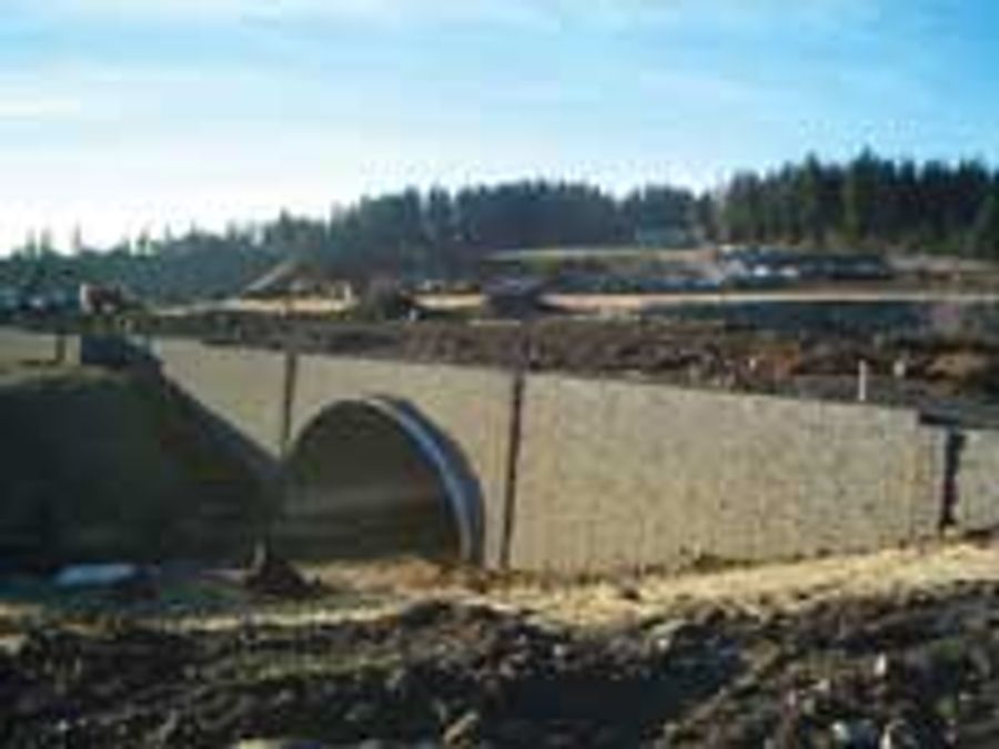 During design, water storage volume and overflow management had to be reevaluated due to site changes. Land Tek increased basin capacity by designing a larger leveling base under the walls, which Menlo connected to the underdrain system. The city and DOT coordinated to connect the overflow system to the interstate highway drainage network.