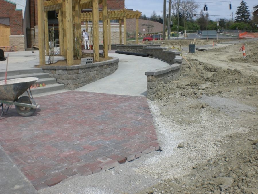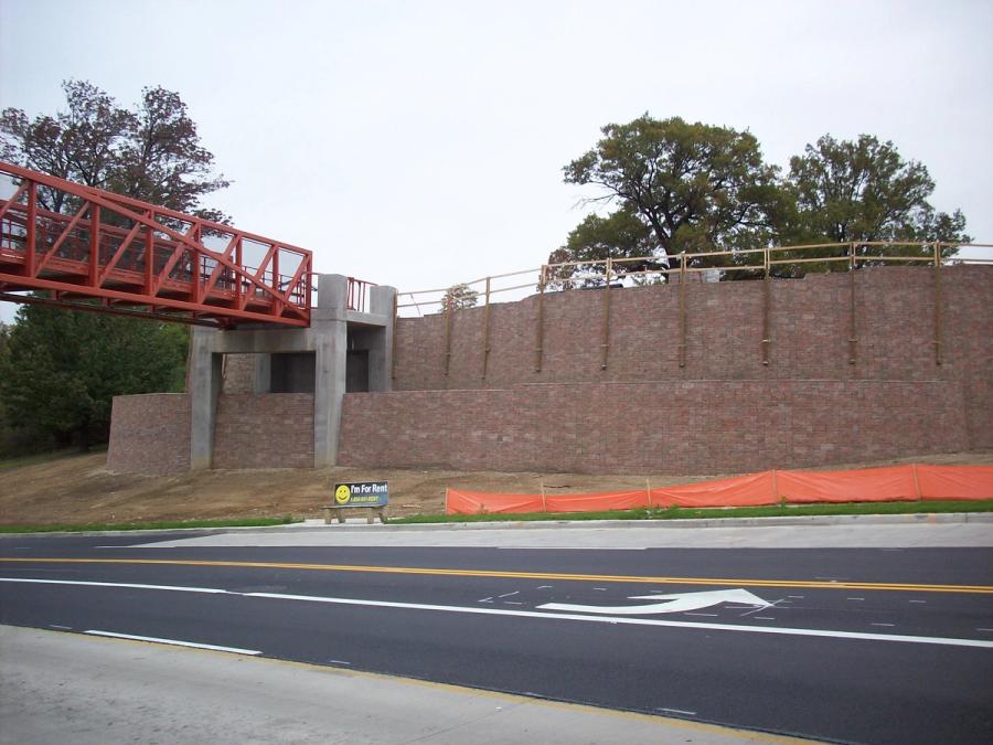 The pedestrian bridge is supported by two, cast in place, piers that extend more than 40 ft (12.2 m) deep into sloping bedrock. One of the construction challenges was to incorporate the AB Europa retaining wall with the piers that support the pedestrian bridge. At the pier locations, a portion of the retaining wall rests on the pier footing while the remainder of the retaining wall resides on compacted granular base. Extra care in subsoil and base compaction needed to be taken to prevent differential settlement at these locations. Higher levels of compaction were achieved by decreasing the lifts to 4 in (100 mm) and performing multiple passes with compaction equipment.