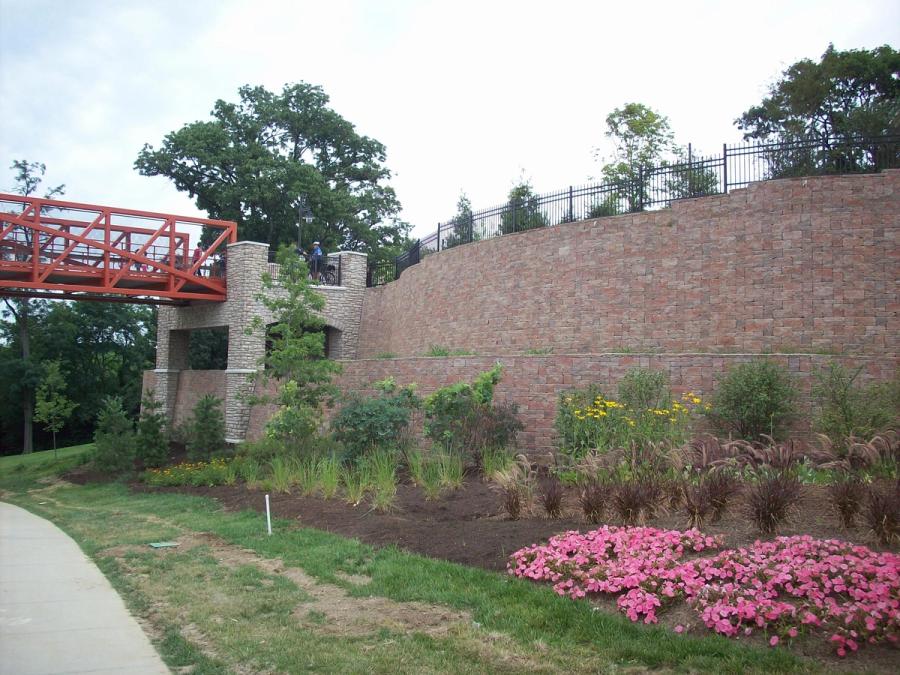 ME Company designed a 25,000 sq ft (2323 sq m) AB Europa segmental retaining wall which raised the site and created enough useable real estate to build an expanded entry plaza and the Historic Vine Street Village. The design also included a pedestrian bridge to get visitors from the new parking lot, across busy Vine Street, into the Zoo which sat 22 ft (6.7 m) above the parking lot area.