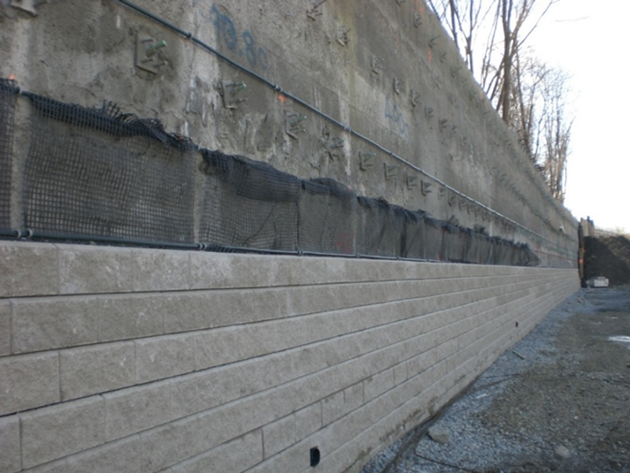 The CSX Intermodal Facility is located in downtown Worcester, MA where space is limited for expansion. Initially, the plan was to use shotcrete and soil nails for the majority of the project and only a small portion of the walls would utilize geogrid reinforced segmental retaining wall block. Problems with the site soils and the aesthetics of the proposed wall did not allow the initial design to proceed. To solve the aesthetics challenge, the overall plan was changed from having 15,000-20,000 ft² (1,400-1,800 m²) of geogrid reinforced Allan Block wall to using Allan Block to face the entire wall including the geogrid and non geogrid reinforced areas. The resulting design used Allan Block to cover all 110,000 ft² (10,200 m²) of wall which satisfied the owner’s aesthetic requirements. Not only did the project encounter multiple design methods for construction, but there were also local utilities that ran behind the wall. Planning for these utilities dictated soil nail or sheet piling placement during construction of the wall. By incorporating multiple soil retention methods, including geogrid, soil nails, and sheet piling along with Allan Block as a facing allowed for a feasible and economical design that met CSX standards for quality and reliability.