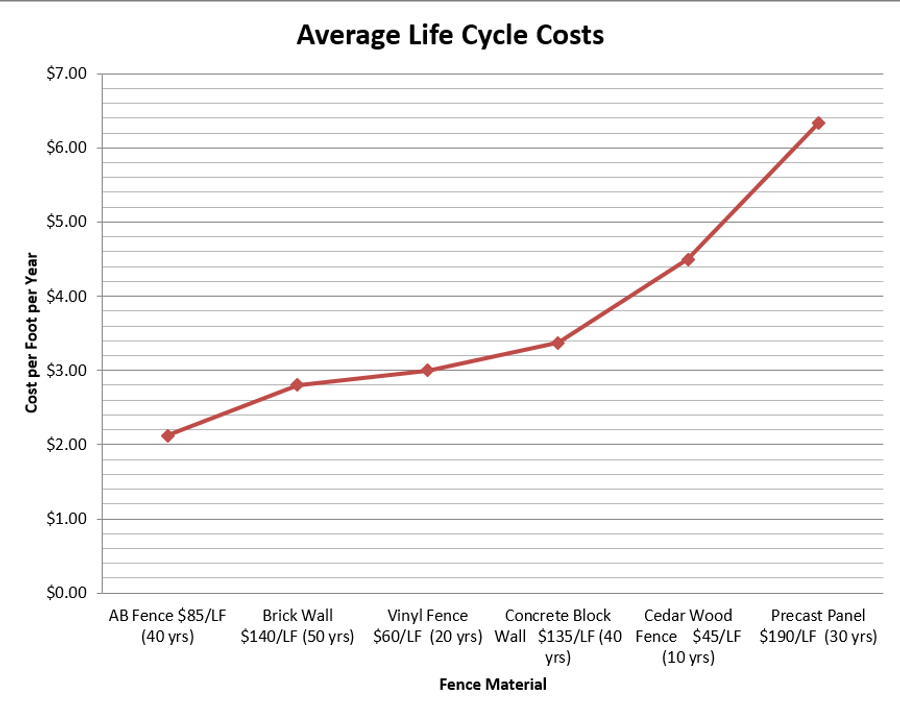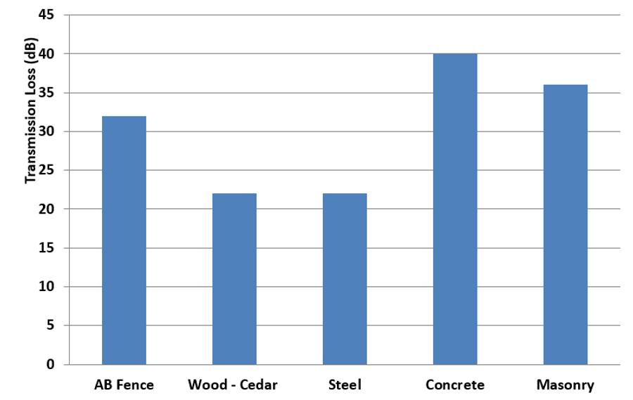 The second issue was the traffic noise coming from the four lane road that ran along the eastern border of the development. By choosing a concrete fence the amount of sound that traveled through the barrier, sound transmission, is greatly reduced. The chart compares the transmission loss in decibels (dB) of different fencing materials. By using the AB Fence the sound was reduced by twice as much when compared to a wooden or vinyl product. The AB Fence system provided all the benefits of a long-term, cost efficient solution and sound abatement they were looking for.