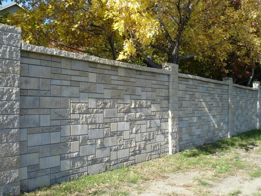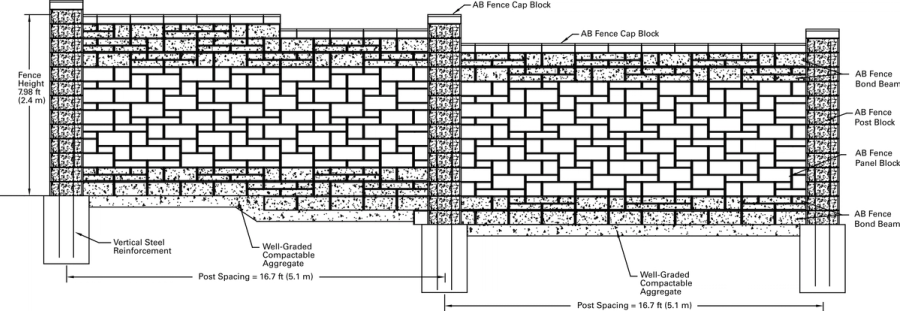 Allan Block Corporation worked with the ECA to come up with the preliminary design for the Ashlar Blend AB Fence. The fence was designed with a wind loading of 80 mph (129 Km/hr) with moderate exposure. This design allowed the 8 ft (2.4 m) tall fence to have spacing between the posts of over 16 feet (4.9 m). The designed pile footings for the fence were 2 ft (0.6 m) in diameter and 4.5 ft (1.4 m) deep, however the City required a 5 ft (1.5 m) minimum depth. The panels were designed with reinforced bond beams located at the top and bottom of the panel sections. The bond beams were constructed by using a #4 reinforcing steel between two courses of block that were grouted together. Since the panel sections were 12 courses tall, this meant that eight courses for a total height of 5.3 ft (1.6 m) were dry stacked between the bond beams making the AB Ashlar Pattern easier to install. To carry the AB Ashlar Pattern look throughout the full panel, a single course pattern was used to build the bond beams. The design also called for flipping random blocks around to change the appearance of the fence. This ensured that both sides of the fence had the aesthetics of a random AB Ashlar Blend.