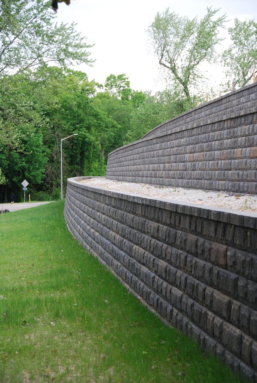 The Grand Rapids Home for Veterans project had many parts that needed to be considered, from geogrid lengths and tall wall considerations, to surcharges above the wall and fence overturning calculations. The designers at Holland Engineering had their hands full, but Josh and his team, by methodically stepping through each area of the wall with the assistance of Allan Block’s Best Practices and AB Engineering Manual, were able to design this stunning new terraced landmark that will stand for years to come.