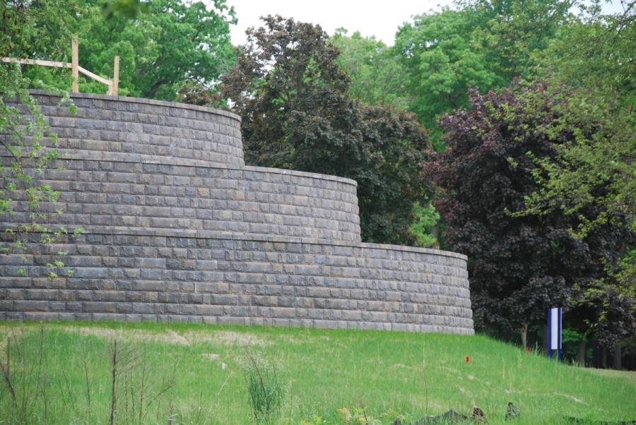 The new facilities are comprised of four separate housing units, three of which need retaining walls due to the slope of the existing terrain. The older facility “felt more like a hospital than a home.” Tower Pinkster, the architectural firm for the project, aimed to change that. The current landscape features sloping hills and large portions of the 90-acre lot are covered with wooded areas. The retaining walls themselves would step up into three tiers, creating a great overlooking view of the local community and the addition of much-needed usable land. The decision to use wide curves was made to ensure adequate spacing was provided, as well as an aesthetically pleasing look to the terrain. Tower Pinkster specifically chose the AB Fieldstone Collection to meet this aesthetic look to blend into the 90-acre wooden landscape. The location of the walls resulted in a terraced structure, reaching heights of 16 ft (4.8768 m) , putting resident and worker safety at a high priority. Fencing above the wall needed to be considered to minimize.