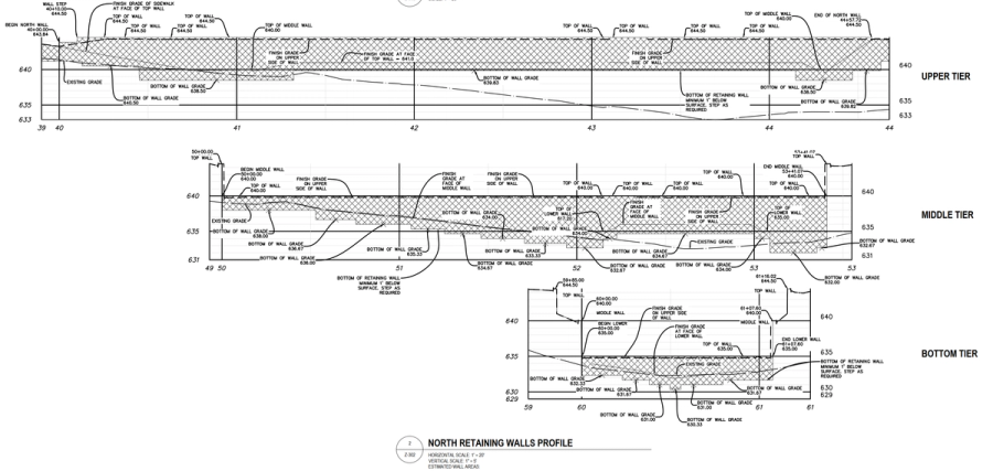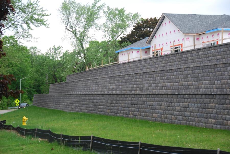 With the size and multi-tier aspect of the project an engineering firm with high standards and expertise was selected for the project. Josh Host with the other engineers at Holland Engineering was that firm. The final design used geogrid reinforcement as well as a combination of 812 and 824 AB Fieldstone facing units throughout the terraced structure. Holland Engineering designed the tiered walls individually following AB Best Practices. Terrace walls should be treated as a single structure when the upper tier falls within twice the height of the lower tier. AB Best Practices recommends that the upper walls be applied as a surcharge to the lower wall and to design the grid length as 60% of the total structure height.