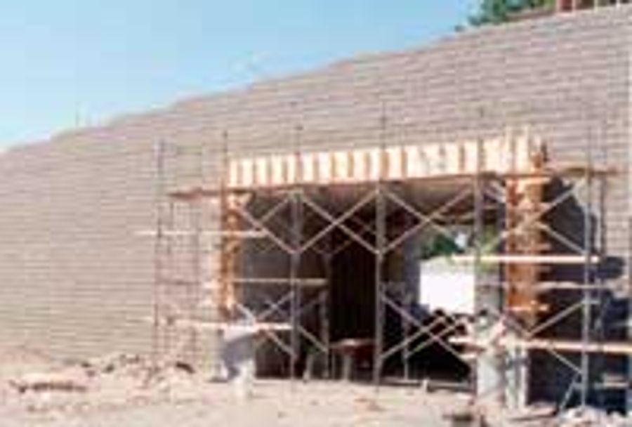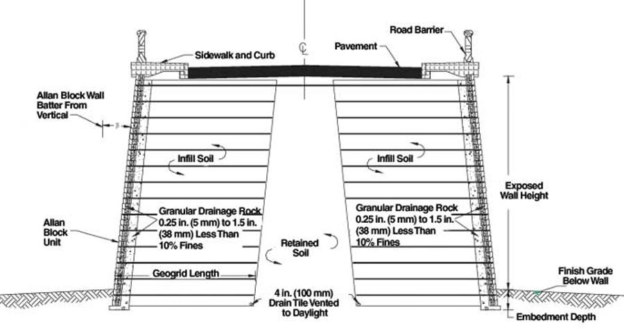 Prior to constructing the wall the top two courses of Allan Block were grouted together, the top course of geogrid reinforcement extended from one wall to the other, and the cap blocks were added to keep the step downs less than 6 in. (15 cm).