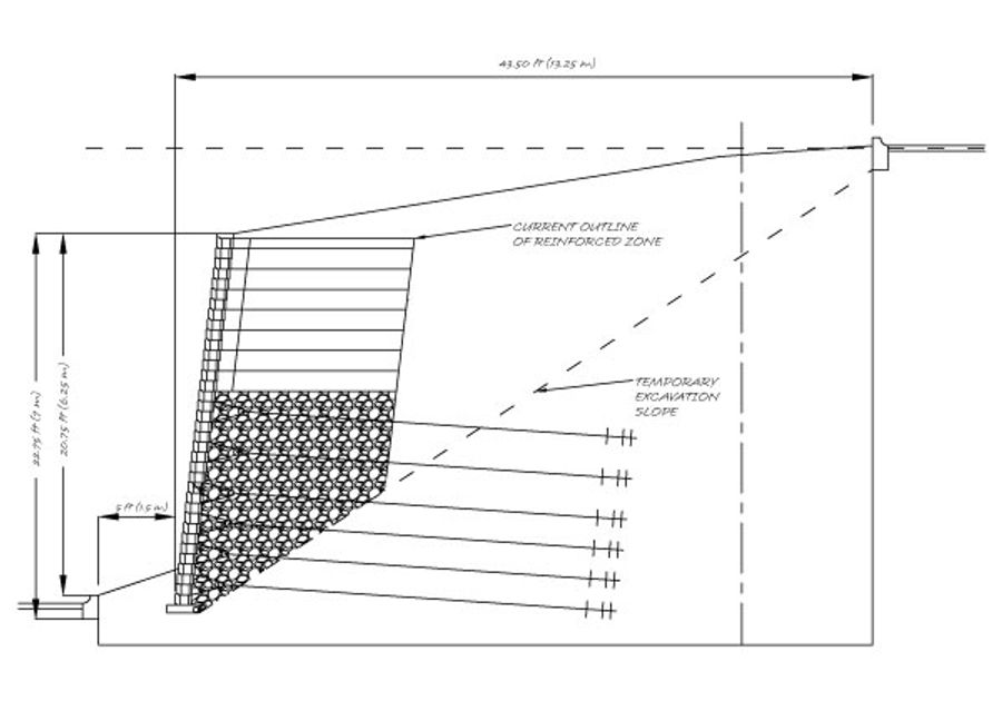 Once a general plan was developed, Reading Rock (licensed Allan Block manufacturer) began working with the design team to see what type of reinforcement options would best fit the site. Throughout the process, Freund looked at reinforcement options for use with the SRW such as geogrid reinforcement, No-Fines concrete, soil nails, and sheet piles. A geogrid application typically provides the most cost-effective solution and that was the first choice of the design team and owner. The Allan Block engineering department was consulted to review various options and while reviewing the site with Virgilio & Associates, global stability was quickly found as the controlling factor. As stated by Ryan Freund of Virgilio & Associates, the location of the retaining wall system quickly became a major design problem. Bill Wyzgala with Midland Standard Engineering & Testing was brought into the design team to review the reinforcement options and establish a working global stability model, in order to maximize the space on site. By evaluating the site stability, it was determined that most walls could use geogrid reinforcement, but two of the retaining walls would encroach on adjacent properties which had to be addressed with a solution other than geogrid. Clayco and the rest of the design team reviewed three final options for those two walls which included; sheet piles, soil nails, or work out a deal with the neighboring property owners. Thankfully, a successful negotiation led to the receipt of a construction/temporary easement. However, one property would not allow encroachment due to a new roadway that had just been placed. The next option was to review sheet piles and soil nails for that wall. Due to cost and aesthetics involved with sheet piles, soil nails were selected as the reinforcing option while facing the wall with the same SRW block as the rest of the site.