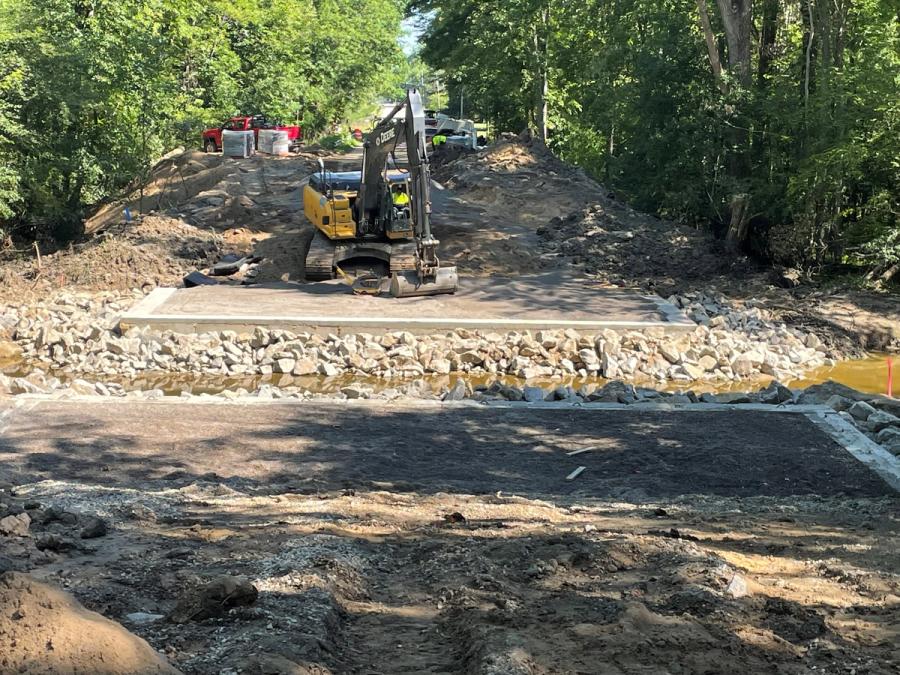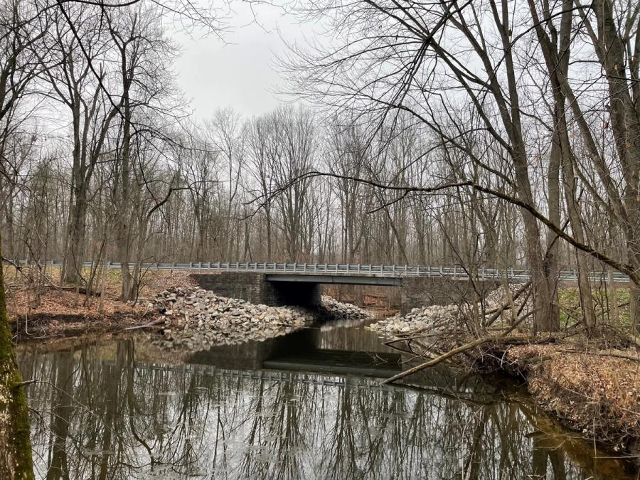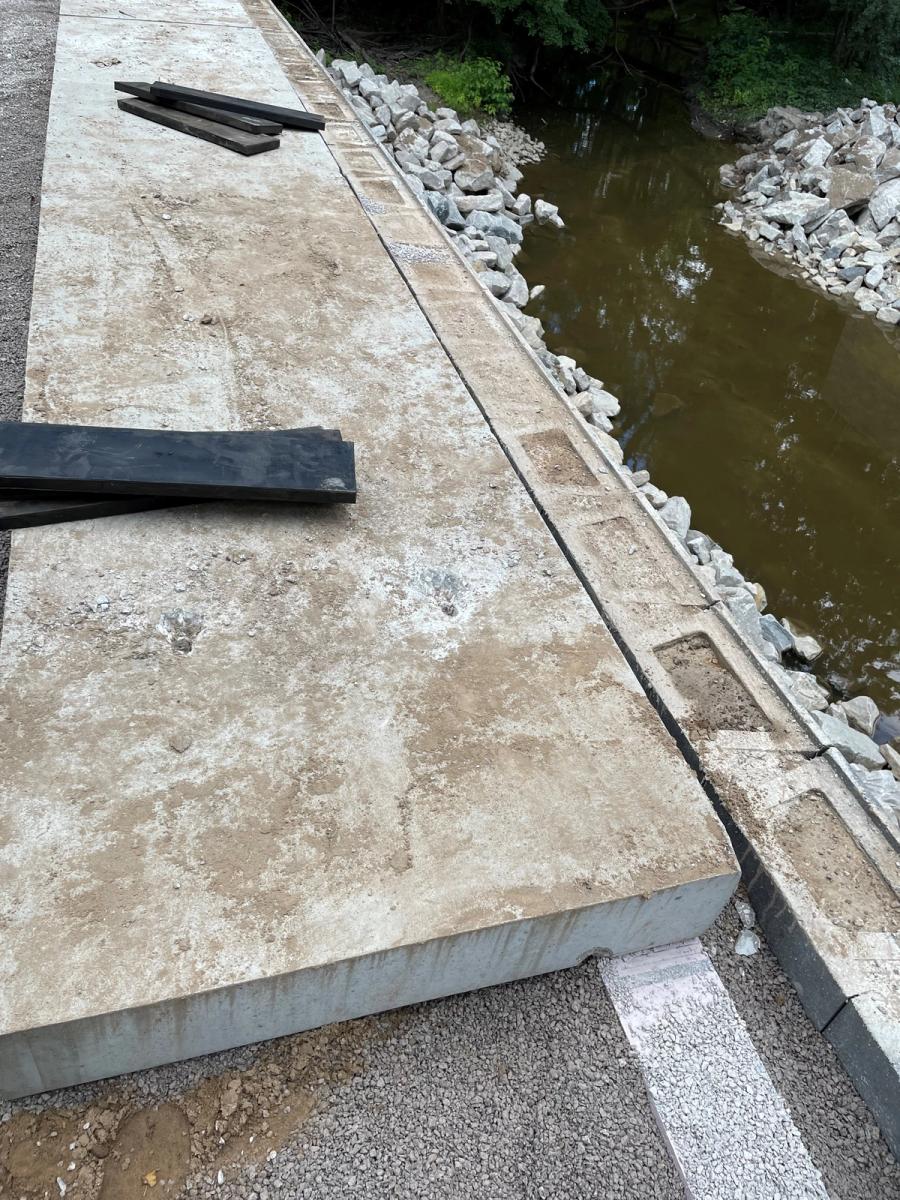 The Midland office for OHM Advisors was involved with the design of the bridge. The goal was to create a recipe that would provide the framework to approach similar crossings in the county like this one over Bullock Creek. What made this project unique was the use of a tongue and groove concrete foundation. There were concerns about the bearing capacity of the local soils based on the geology of the region and the presence of Bullock Creek running between the abutments. Instead of the traditional wrapped aggregate foundation the choice to use the concrete pad provided the bearing capacity and level surface for the abutment to be constructed. Additionally, this design choice would allow excavation to be completed without diverting the creek, reducing the construction time.