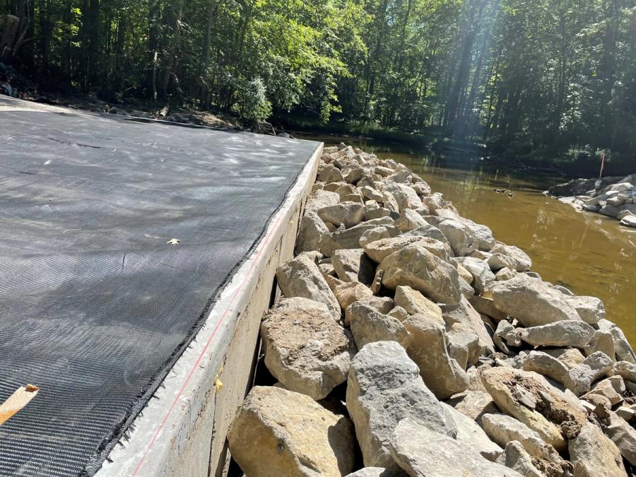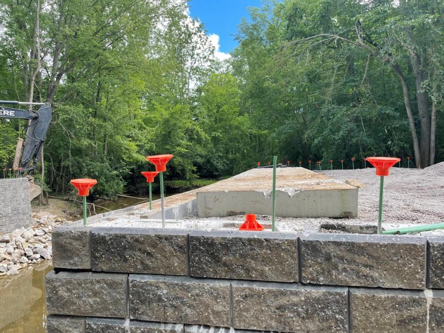 Although money was allocated for the project in the county’s budget, the Midland County Road Commission knew they needed a solution that would suit the small span without breaking the bank. The area is not heavily developed and wouldn’t be able to accommodate a large crew and equipment. The idea of a Geosynthetic Reinforced Soil – Integrated Bridge System - GRS-IBS solution had been kicked around but since the Federal Highway Association (FHWA) guidelines reference concrete masonry units (CMU) the support was unenthusiastic at best. This is where Sam Jansen with Consumers Concrete Corporation stepped in with a segmental retaining wall alternative and the training necessary to ensure a successful installation. In fact, this was the first GRS-IBS in the county and was used as a test run for several other single span projects that are planned in the future.