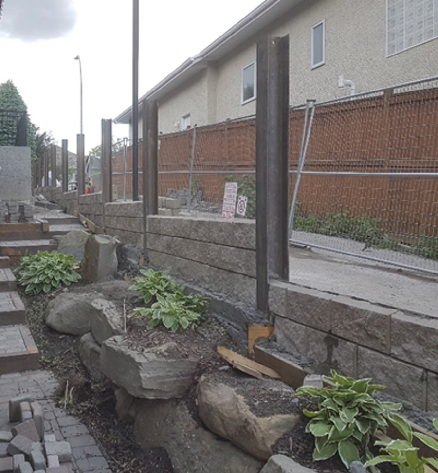 The fence was to be placed as close to the property line as possible. However, the design of the AB Fence post blocks extends out from the plane of the fence panel about 3 inches (75 mm) on either side, which would require the fence to be moved away from the property line reducing the walkway to their backyard. In order to minimize the footprint of the fence and maximize space for a walkway, 6 inches (150 mm) wide I-beams were suggested to be used instead of AB Fence Post Blocks. Allowing for the fence to be completely flush on both sides.