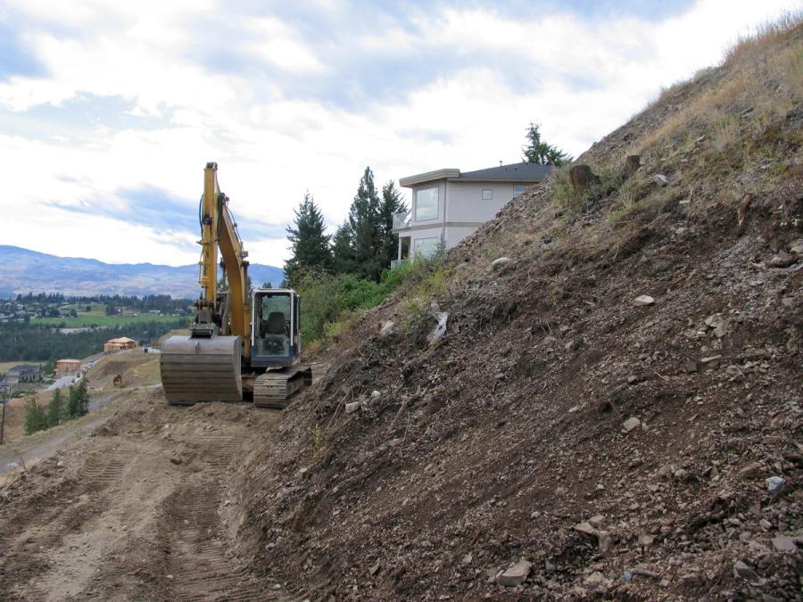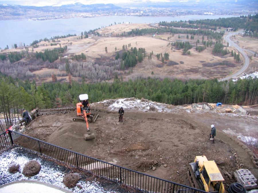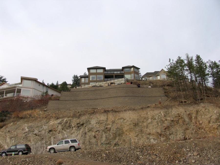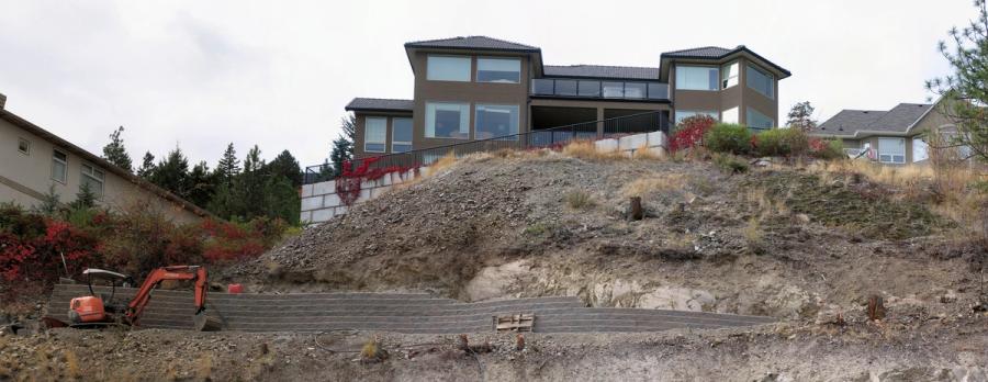 The Tocher residence is perched on a small plot of land overlooking Okanagan Lake in West Kelowna, British Columbia. Although the location provided beautiful vistas, the steep slopes and small lot size limited use of the tiny backyard. For the Tocher’s, the plan was to replace the smaller retaining wall located close to the house with a substantially larger wall near the property line to create enough useable space to install a swimming pool.