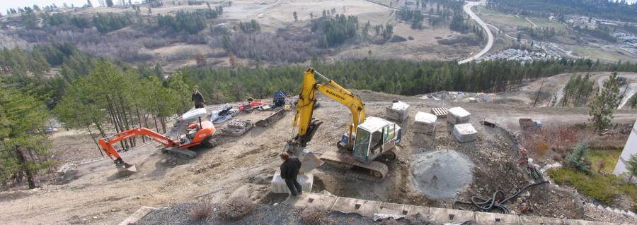 Two blasts were required to complete the job. The first blast was done to create an adequate ledge for the lowest wall to be built and the second was to gain sufficient clearance between the second wall and the steeply sloped rock face. Although blasting required additional work, the blasted rock left behind provided good granular material to be used as infill behind the wall. Very little fill needed to be brought on-site to complete the job.