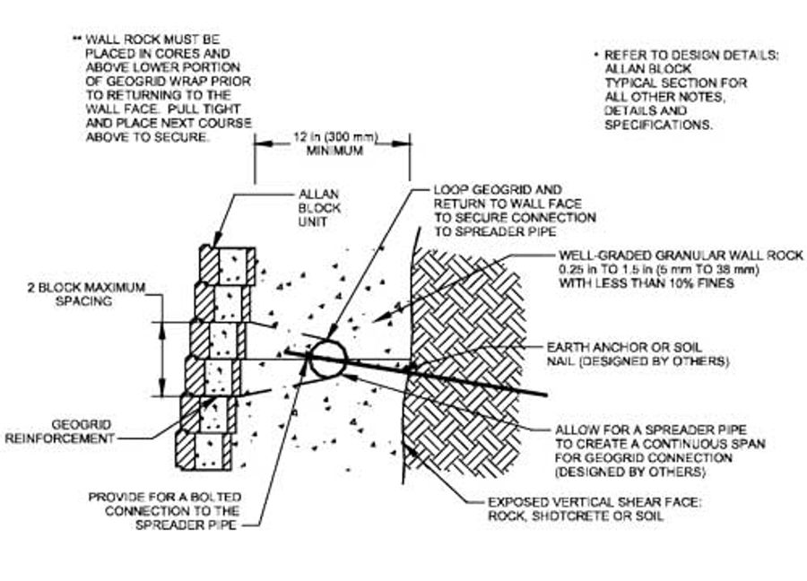 The second wall would utilize geogrid to reinforce the wall in lengths of 32 ft (9.8 m), where space allowed, and pinning to the rock face where insufficient clearance occurred. Subsequent walls above would also be reinforced with geogrid.
