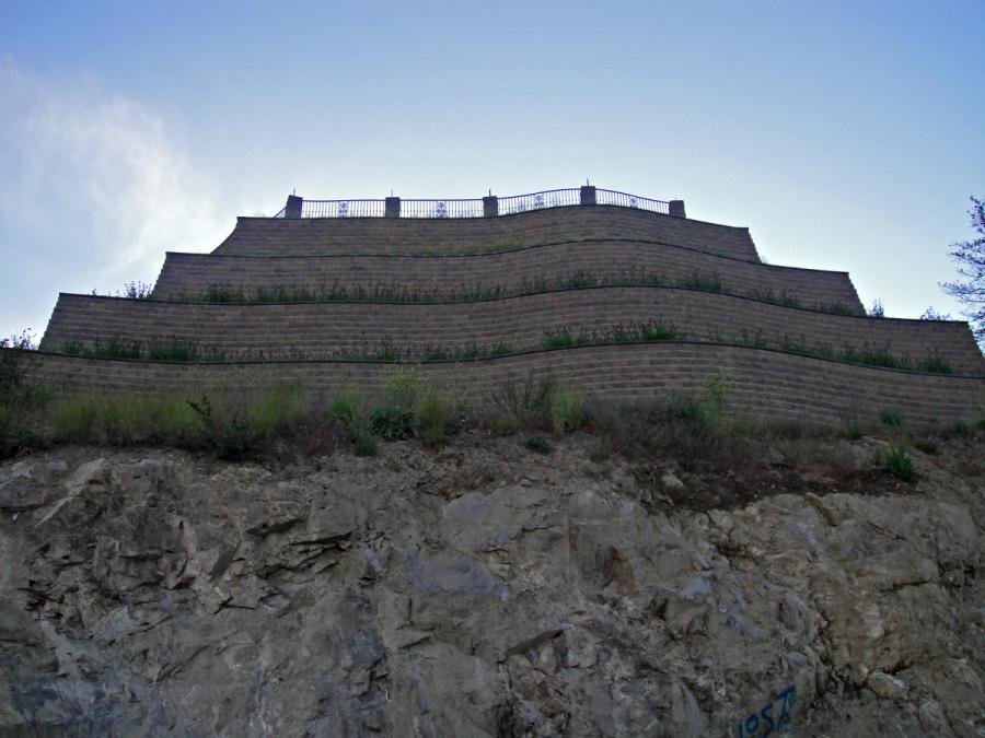 Maximizing useable space required creating a somewhat rectangular area that closely mimics the property boundaries. The landscape contractor created a unique design that adhered to the need for a rectangular space but incorporated a unique series of curves, between the 90° corners, to soften the lines and give a more natural appearance to the wall. The color and geometry of the walls also mimic the orientation and color of the rock outcroppings below which makes them fit in with the natural surroundings better than many large wall projects.