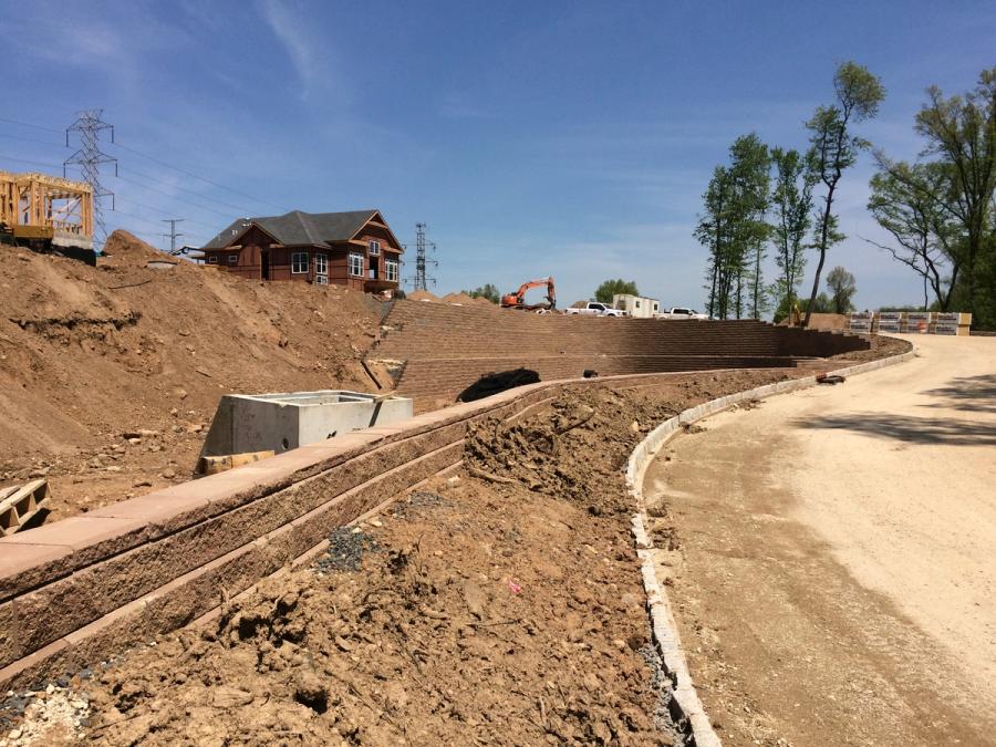 One benefit to this location was that the site soils consisted of sandy glacial till which allowed the use of existing soils, mixed with pulverized material from other areas of the site, in the infill area behind the wall facing. The free-draining property of this soil coupled with toe and heel drains, which were installed behind the wall, will allow it to handle any incidental water that makes its way behind the wall facing in accordance with Chapter 3 of the Best Practices for SRW walls.