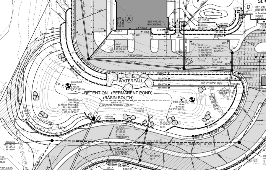 The waterfall was not the only aspect of the site that would require the wall to be carefully planned out. In addition to the wall tying into the natural stone waterfall, there were two specific conditions that needed to be addressed. First, there would be a lake at the base of the wall that the design would need to accommodate. Second, terraced walls would be designed and constructed to overcome the 25 ft (8 m) grade change and meet the aesthetic demand of the owner.