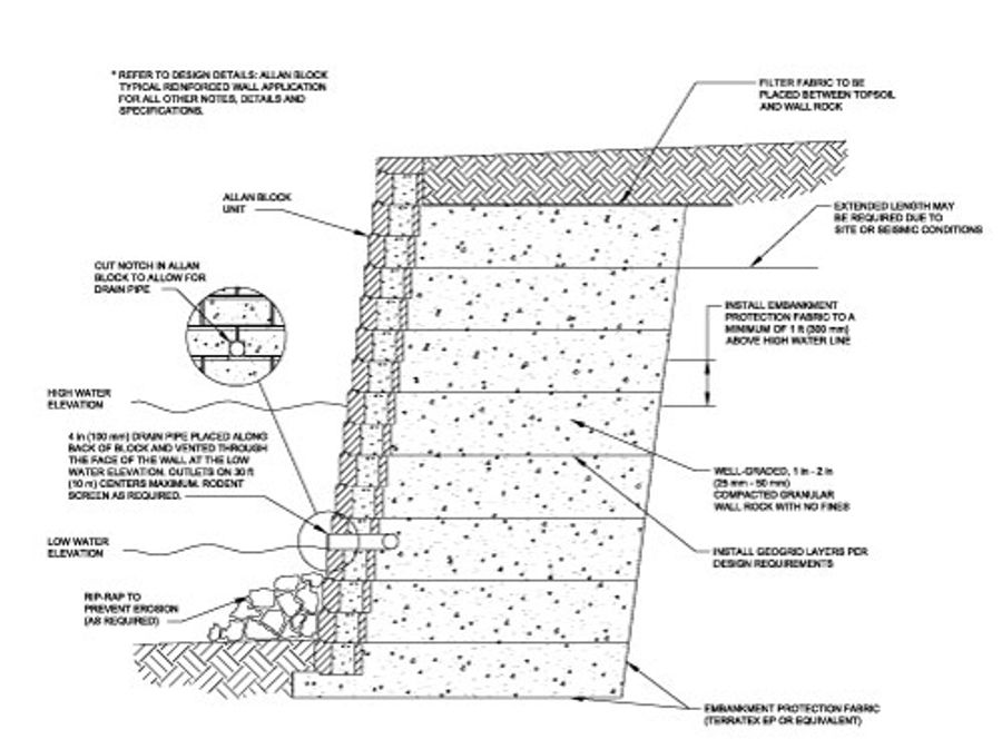 The last major design consideration that Robert had to design for was that there was to be a small pond below the walls that the waterfall could flow into. Because of this pond, all of the lower walls had to be engineered to properly handle water moving through the retained soil that exceeded incidental groundwater. To accomplish this, Chapter 5 of Best Practices can be referenced. Chapter 5 states that if a wall is constructed to be a water application, the wall rock should be placed to the limits of the geogrid length up to a height of 1 ft (0.3 m) above the high-water mark, or in the whole infill zone. The detail above shows how one of the water application walls was designed for the project. The drain pipe should also be raised to the low water elevation to help with the draining of water from the reinforced zone of the wall.