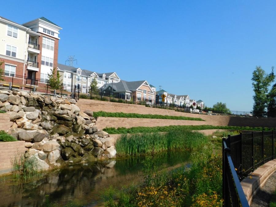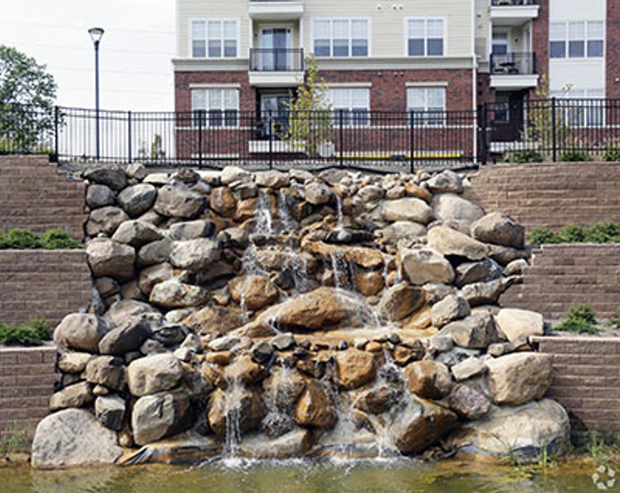 Every so often an Allan Block wall is constructed that extends beyond creating additional usable space. This project, in Livingston, NJ, is definitely one such application. The ParkVue at Livingston project incorporates an Allan Block retaining wall system with natural stone for a striking transition that surrounding wildlife can enjoy along with a newly constructed apartment complex. The natural stone divides two sets of tiered Allan Block walls and allows water from above to flow freely into the pond below, creating a man-made waterfall. The stones themselves were actually found on site and re-purposed for this application. Coupled with natural vegetation on top of each wall terrace, the structure blends seamlessly into the environment.