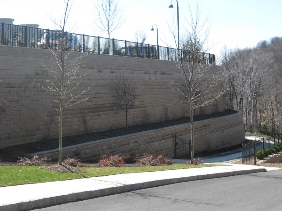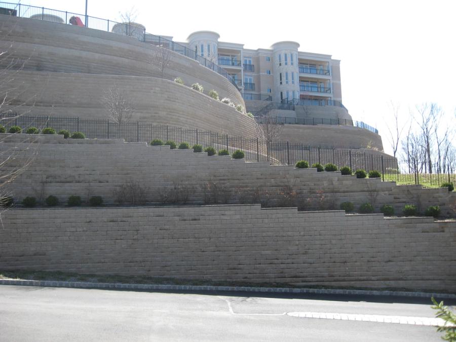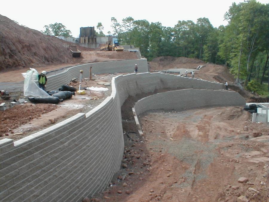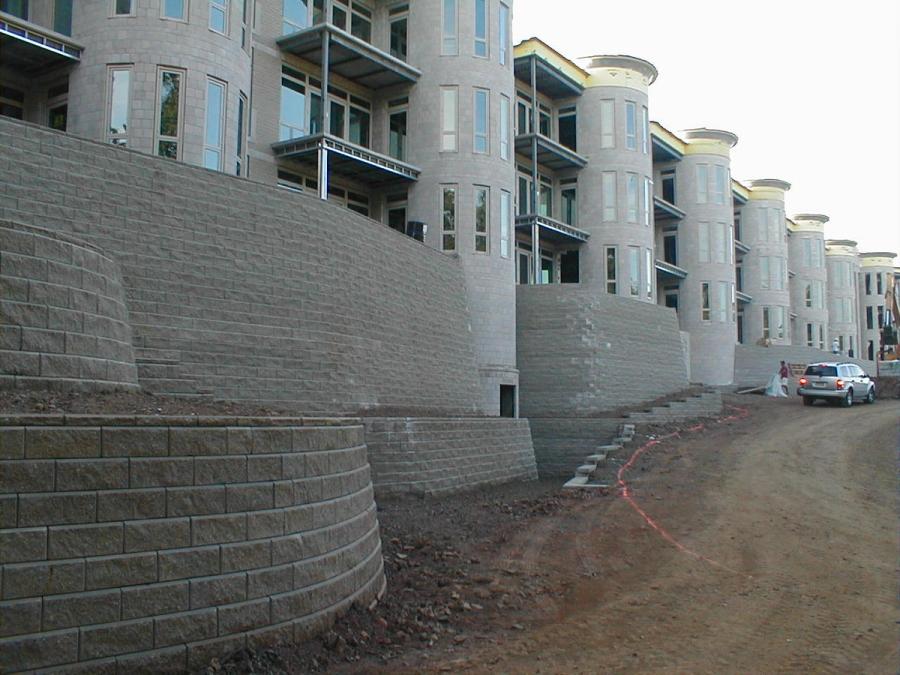 Porcello Engineering was contracted to design the Allan Block retaining walls because of their familiarity with SRW design and construction. They had designed many Allan Block walls, but these were different, as they were very tall and they supported the buildings directly on top of them.