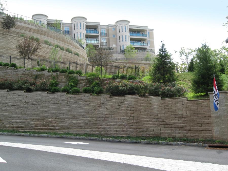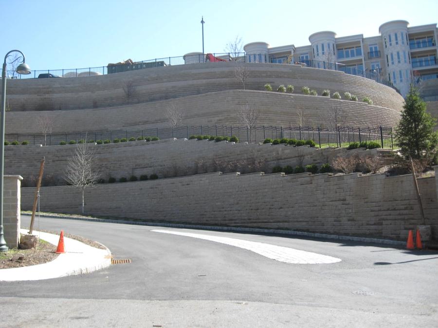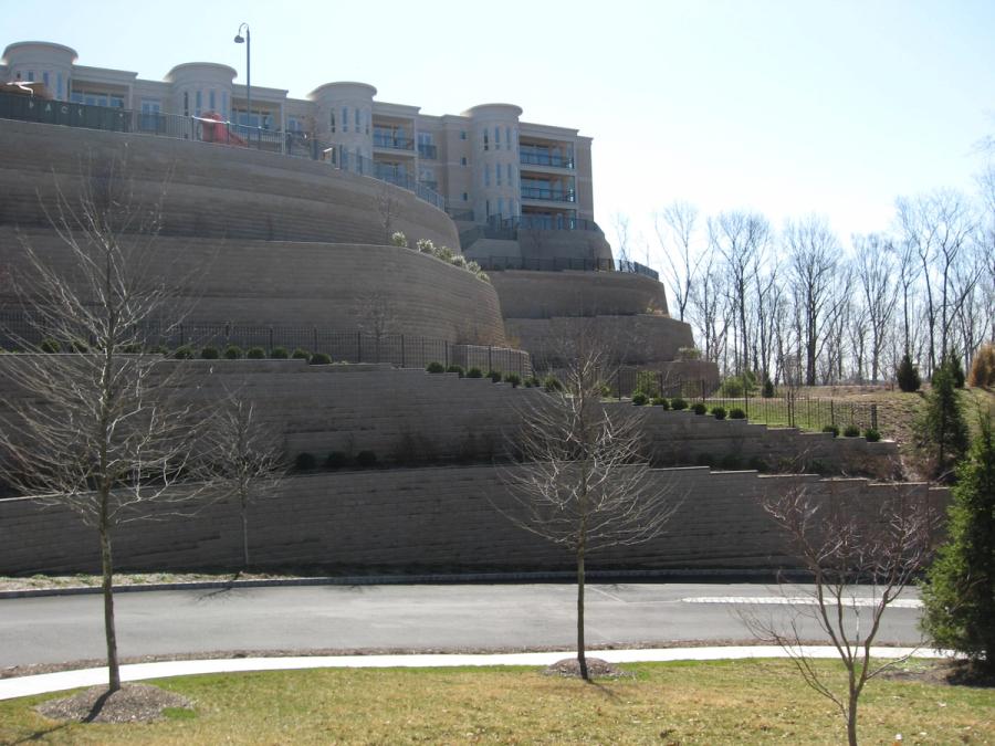 A project as large and complex as Skyline Ridge takes careful planning and coordination from the beginning. The site civil firm, Casey and Keller, started with the basic need for a large flat area to build the condominiums. They could have chosen to build one tall wall around the site, but the Owner, Garden Homes of Short Hills, New Jersey, chose to break the height into shorter terraces with accenting landscaping on each level. The walls not only provide the necessary grade change, but also support the parking lots and recreational areas and in some areas support the condos themselves. By allowing adequate time to plan the site, Casey and Keller, Inc. was able to plan for the building footings above the reinforced soil mass and for the required utilities and their placement locations and produce a detailed water management plan for the site.