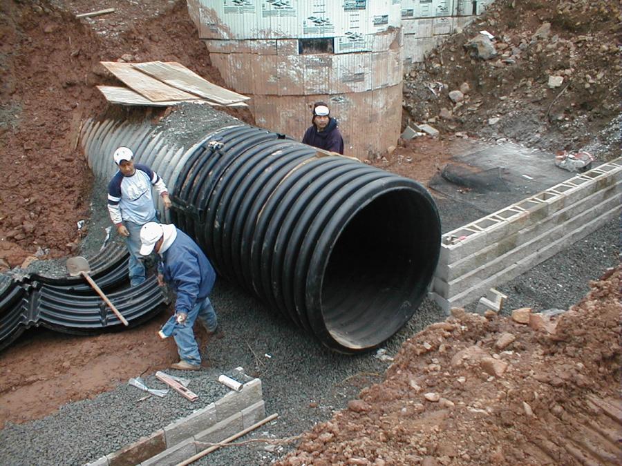 Most of the utilities were brought to the site under the single access road leading in and out of the property. This was done in part to avoid potential interference with the reinforced soil masses of the wall structures. The site drainage is handled with many drop structures, all draining to a large detention basin near the lowest part of the project. Most of the drop structures were built outside the reinforced soil mass, but one needed to drop down through the mass and out the face of the wall. By having an early plan, Casey and Keller was able to highlight this drop structure for the wall designer to incorporate in the wall construction details.