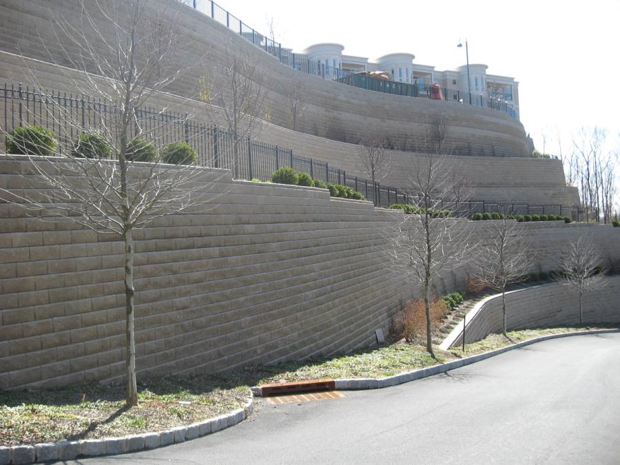 The Skyline Ridge development is a large residential community with 90 luxury condominiums overlooking the Manhattan skyline. The original site was very hilly and provided no quality space for building. The solution was a set of large Allan Block walls built to form a construction plateau. The project has 17 Allan Block walls consisting of more than 75,000 AB Classic block and a maximum grade change of 90 ft (27 m).