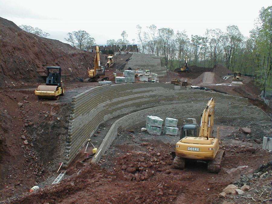 During the beginning of the project the focus was on building as much wall as possible and getting the utilities in place. The lower walls were between 10 (3 m) and 20 ft (6 m) tall which under normal condition would have grid lengths between 60 and 80% of the wall height. These, however, were the base for a terraced structure reaching a height of 70 ft (21 m) so the extremely long grid lengths posed a challenge to Pillari. Pillari was careful to install the grid correctly by first connecting it to the facing and then pulling it back and staking it tight. They were also careful when placing the infill material; they always started at the facing and filled back towards the tail of the grid layer. This way, the natural placement and compaction of this material would act to pull the grid and facing tight into the soil mass. If an installer places the infill material starting at the tail of the grid and works towards the facing, slack will appear in the grid layer at the facing.