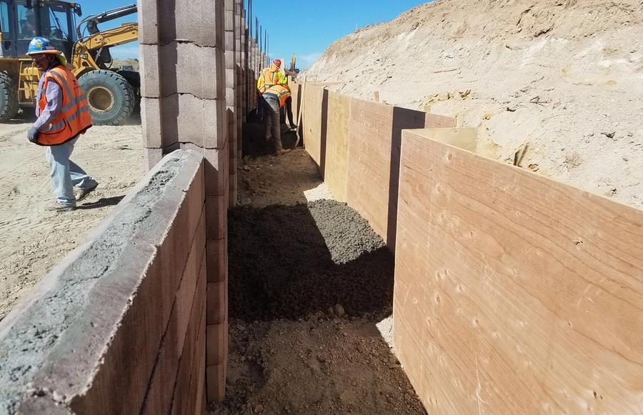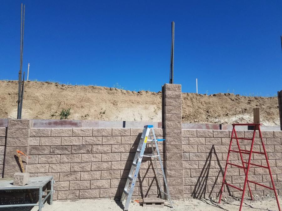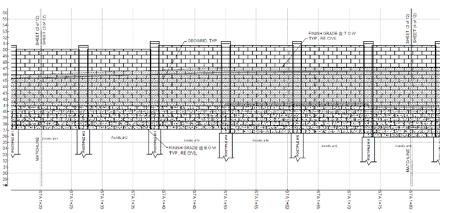 Bedrock was encountered much closer to the surface than expected once pile construction began. Twenty-four-inch wide footings (SK Wall Design recommendation) were not going to be possible the entire depth of the post because of this. Slaton worked with SK Wall Design who reran calculations to determine 18-inch piles would be sufficient once bedrock was encountered. The original calculations were conservative because of soil parameters originally provided to them and having the ability to use an existing 18-inch auger with appropriate tip to drill through the bedrock saved significant time and money.