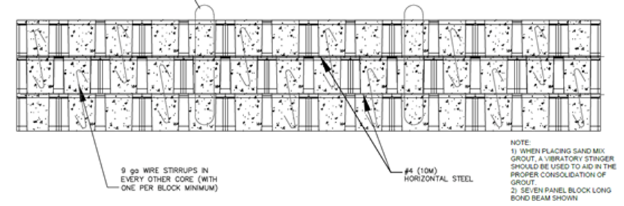 No-Fines Concrete (NFC) has been used for 20+ years with Allan Block retaining walls and geogrid has been used for 35+ to reinforce soil behind segmental retaining walls. On the Springs at Eagle Bend project, both NFC and geogrid reinforced soil were used behind the AB Fence to ensure it would withstand the soil pressures. In most fence sections, SK Wall Designs created a CCS (Complex Composite Structure). A CCS is a single wall section with two distinctly different structures positioned one on top of the other. In this case and in most sections, you have NFC working within the bottom portion of the wall with geogrid reinforced earth sections directly on top (see section #1). The result created a structure with up to 5 feet (H) x 5 feet (D) of NFC with geogrid depths of up to 7 feet on top of the NFC to create the reinforced earth portions (see figure #1).