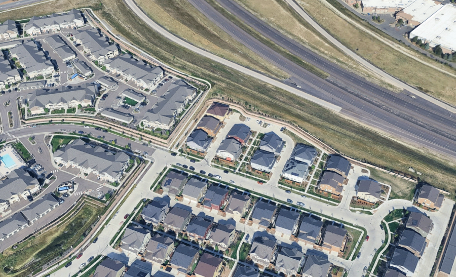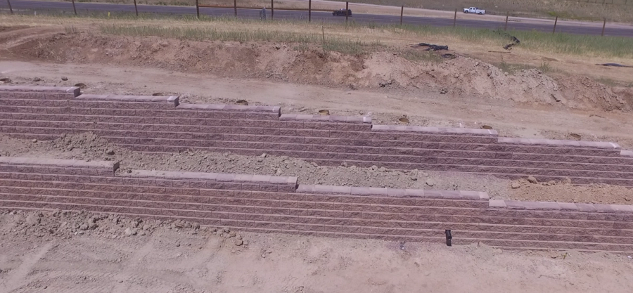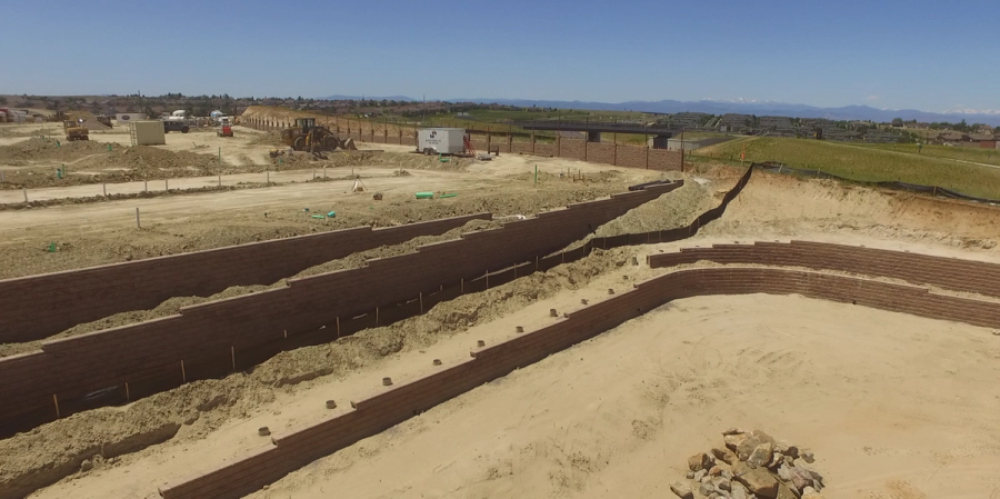 Local codes required noise abatement walls between the new Springs at Eagle Bend complex and the existing I-470 Expressway. The noise abatement walls would need to reach heights of just over 16 feet to perform as the required sound barrier and in that exact area a grade differential of up to 12 feet would need to be resolved as well. Multiple locations on the site had vast grade changes that would require an additional 12 retaining walls to correct grade differences of up to 14 feet. Continental Properties pulled together a team consisting of General Contractor, Dosters Construction and local AB Certified Contractor Slaton Brothers to help them solve the many site challenges. The goal was to find a common system to solve the various site challenges – Allan Block products manufactured by Basalite Concrete Products in Denver provided just the solution!