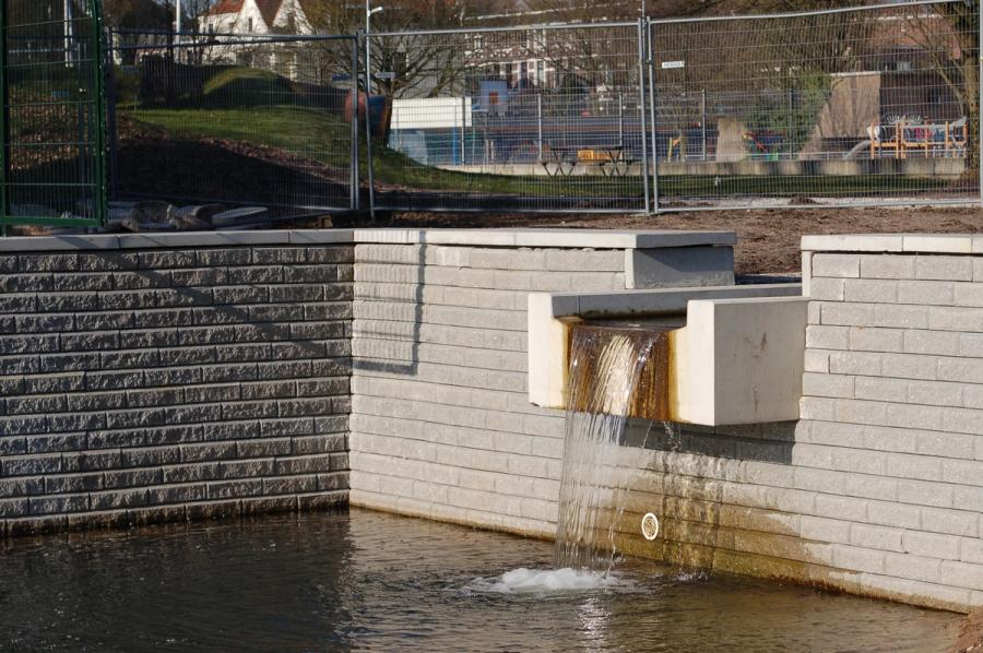 The local wall designer used the Allan Block design program, AB Walls to design the nearly 8 ft (2.4 m) tall water application retaining wall. Because the Allan Block retaining wall was to be such a prominent part of the park, the architects chose AB Lite Stone in a grey split faced appearance to compliment the site due to its long but short characteristics, manufactured by GODELMANN GmbH & Co. KG. They said it was the perfect choice for the site and helped make the wall appear shorter in height. The wall has become the perfect boundary between the school campus, playground, and the Molenbeek Creek.
