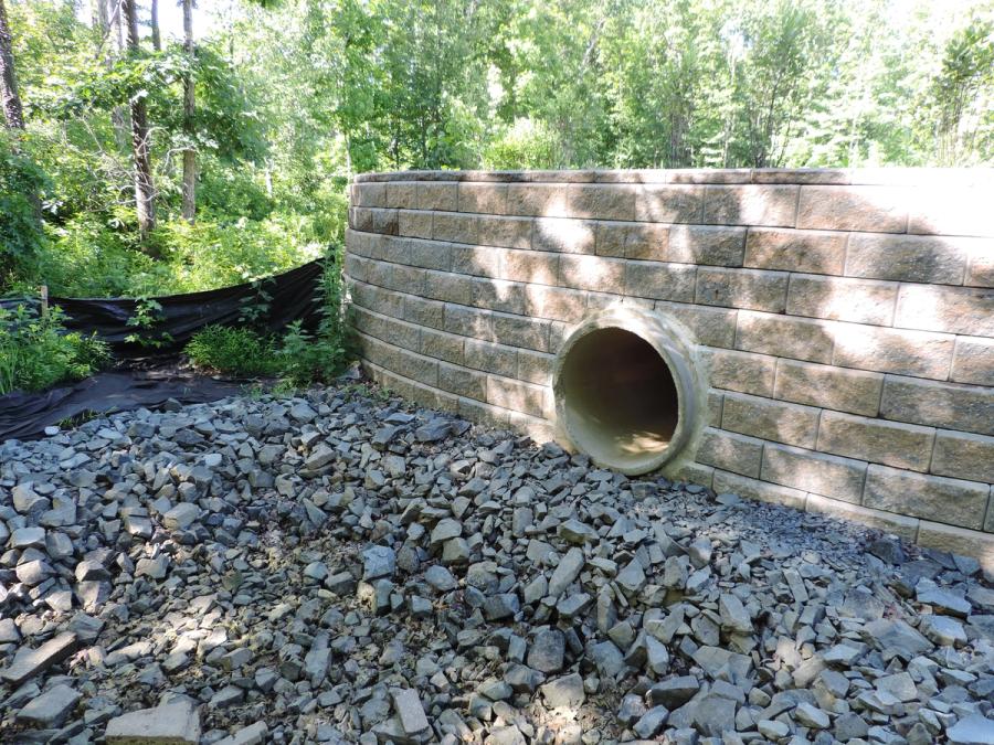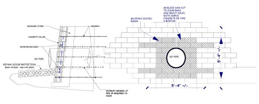 Water enters the basin naturally with localized runoff as well as by a 30” (76 cm) diameter storm water collection pipe. Efsen Engineering designed the wall facing to be the culvert headwall for a very clean aesthetic appearance. Using rebar and grout the contractor carefully cut the Allan Block units to fit around the pipe. Due to the potential for heavy water flow entering the basin, scour was a concern. Efsen Engineering designed a concrete spill way at the outlet of the pipe to disrupt the water flow.