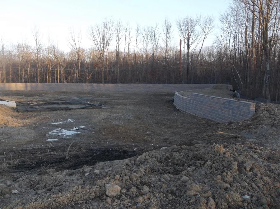 Efsen Engineering was retained to do the wall designs because they have vast experience in designing segmental retaining walls, particularly Allan Block walls. French & Parrello Assoc. was retained to provide a detailed site evaluation and provide the required soils information for Efsen Engineering’s design. Analysis of the permeability of on-site soils verified that they could be used as infill. Using this information, back to back geogrid reinforced Allan Block walls were designed to hold back the full volume of the basin.