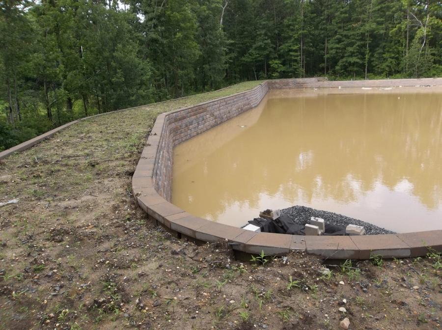 BCU has installed many retaining walls so wall construction was straightforward for them. After initial grading was complete and the storm water pipe was placed, BCU worked with Clayton Block Company to get final hands on training to properly install the Allan Block units. With a little initial guidance they were off to the races installing 500 sq ft (46 sq m) per day. To add to the high end aesthetics, West Windsor planted trees and shrubs on the wall to further blend the basin into the surrounding wooded area.