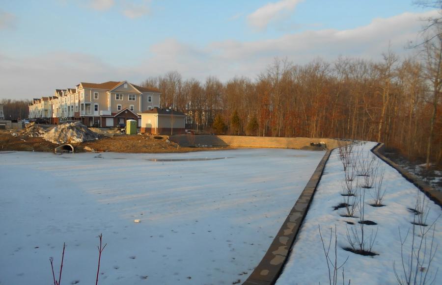 The new residential housing community required a large volume of storm water storage but with its naturally flat terrain and adjacent wetlands finding the right area was an issue. The township required that no storm water migrated directly to the wetlands so a large volume basin (60,000 cu. ft. (1700 cu. m)) was require and it had to be gravity fed and drained by gravity since pump stations were prohibitive due to both cost and maintenance.