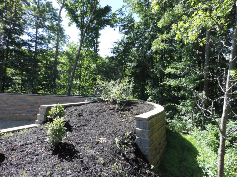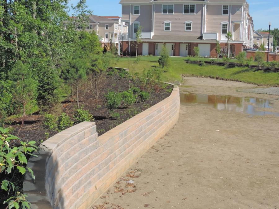 To achieve the required volume, Van Cleef Engineering determined that the basin required a 6 ft (1.8 m) high berm on three sides to be effective. After further site study, space concerns did not allow for a sloped earth embankment so a 10 ft (3.0 m) wide by 8 ft (2.4 m) tall reinforced earth structure formed by back to back Allan Block segmental retaining walls provided the perfect solution both with respect to utility and to provide an attractive addition to the property landscaping. Allan Block was chosen due to its proven track record for performance, durability, cost effectiveness and its ease of installation.