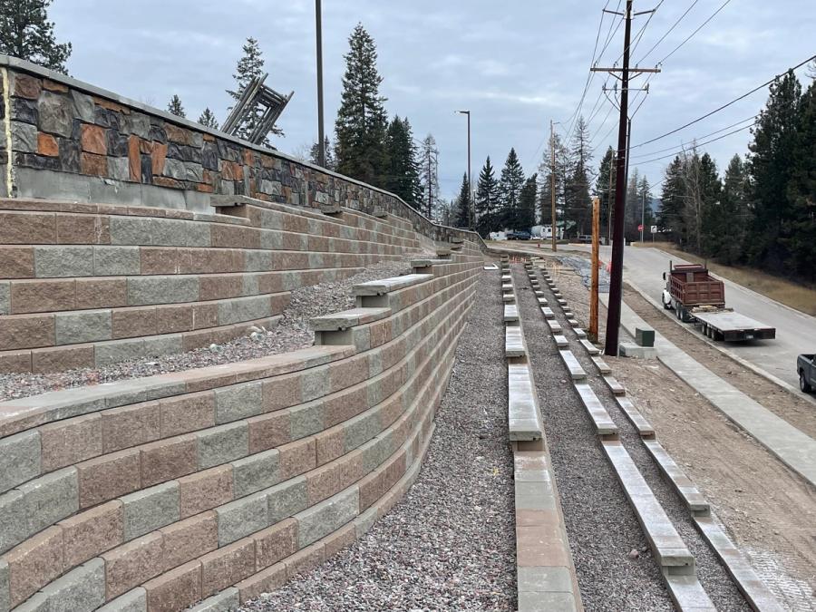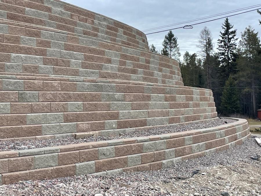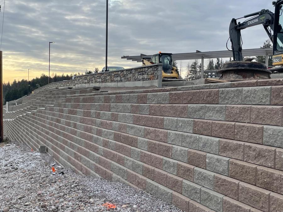 The town of Whitefish needed a new convenience store located at the entrance to town that would provide a wow factor and reflect the desired style of the area as a ‘Gateway to Whitefish’. The site of the new convenience store has a significant grade change on the Southeast and East sides which would have limited the amount of space available for fueling stations. The best solution was to have a terraced retaining wall on those sides of the site, allowing for the fueling stations to remain on the same grade as the store. With the new updates to AB Walls, it was the perfect time to use the new Terrace design feature. “Always Better” is not a just a saying here at Allan Block but embedded in the culture. This applies equally to the design tools as it does to the blocks themselves. This project was the first to utilize this feature, allowing all sections of the terrace to be designed at the same time rather than as individual walls.