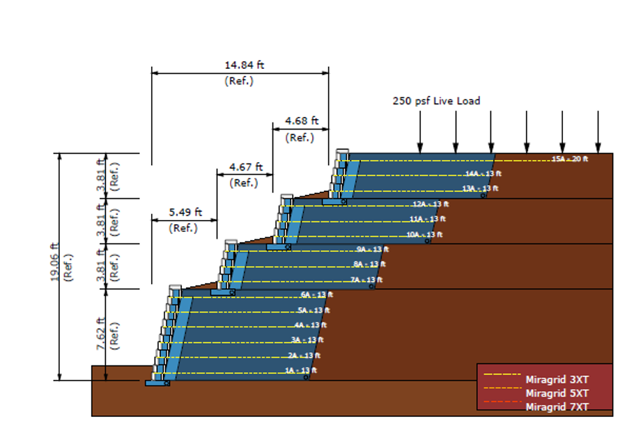 After the block type and colors were confirmed, the next step was to revise an original design and turn it into an Allan Block solution. This is where the AB Engineering was brought in to provide a preliminary design. Derek Jones, working with the contractor, was able to bring in Chris Schlegel from DCI Engineers, Inc. to review the preliminary design and finalize the plans. There were a total of six walls on the site (counting the terraced portions as a single wall) with two having most of their length in a terraced configuration. The updates to the AB Walls software helped cut down on the design time allowing all levels of the terraces to be designed at once. Because all levels were designed together, the horizontal offsets between each were able to be included in the cross section, along with accounting for infill soil and the extra lengths of geogrid.