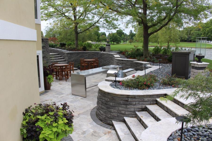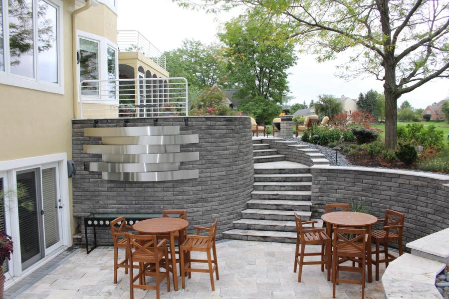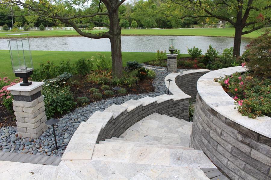 The project had existing materials - pavers and wood deck - that were in disrepair and needed to be removed, but two large locust trees were to remain with the space designed around them. A retaining wall would be needed to create the sunken private patio, but also to create the large raised patio area to replace the existing structure. The retaining wall product that was chosen was the Allan Block Lite Stone as the homeowner liked that low profile style and feel of the blocks. To accent the retaining wall product, a silver premium select grade travertine was then used to finish off the top of the walls and for the patio and stair surfaces.