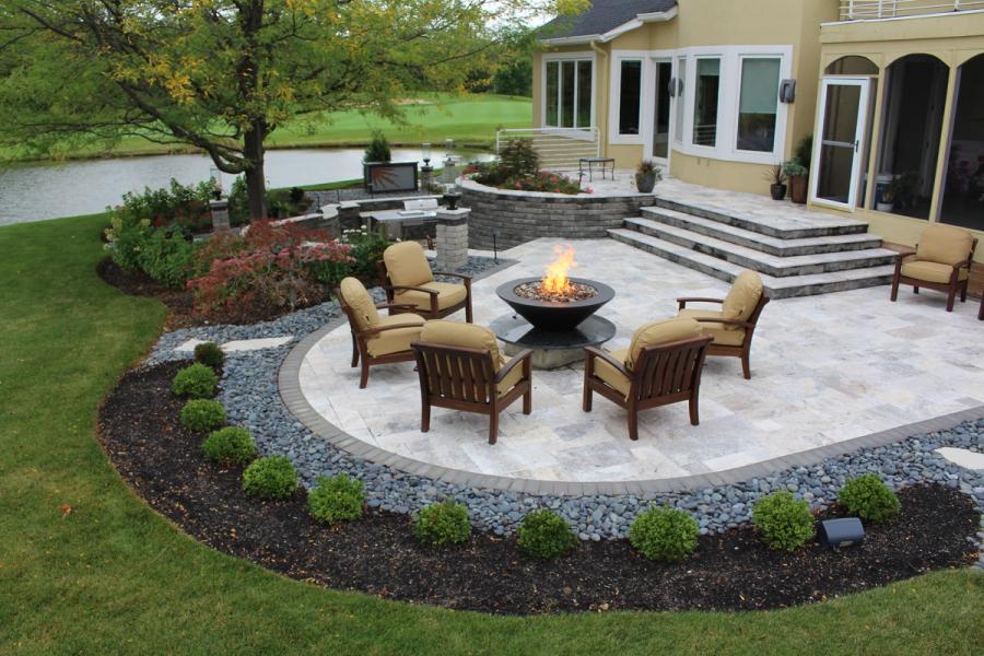 The Yates Project was located on a busy golf course. The homeowner was looking forward to more time at home and wanted a space that could provide some privacy. They wanted the project to have a very contemporary clean feel with stainless steel accents to match some of the interior décor of the home. A terraced living space would need to be designed that would frame and enhance the beautiful views out onto the golf course’s lake from the upper level. While a lower sunken patio level would offer a space for private entertaining and to enjoy the outdoors.