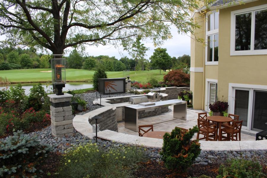 Construction took about 4 months to complete. With excavation done a large curved Allan Block retaining wall was built that wrapped around and concealed the decking system. To keep the gravel backfill away from the foundation another AB wall was built inside the radius wall creating a large window well to protect the house from any potential water damage. The stairway from the upper to lower patio as well as the outer retaining walls were then constructed to create the sunken patio area. The stainless steel accents on the wall and the stainless steel bar were custom designed and locally fabricated. The patio was also surrounded by natural gas lanterns to create a unique look at night. Behind the bar and grill area there is a 60” LED flat screen TV that comes up out of the ground and is all controlled by remote. On the upper patio area there is a large natural gas fire pit. This area provides a great view out onto the lake and is private because all of the golfers are done for the day when they are using the firepit at night.